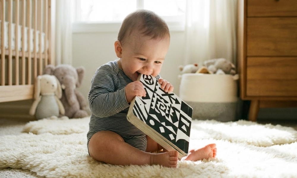 Ilustracije su jednostavne, često sa visokim kontrastom (crno-belo-crveno) jer to najlakše zadržava bebinu pažnju.